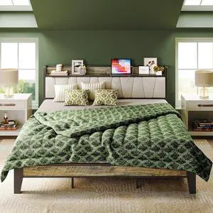 LIKIMIO California King Bed Frame, Storage Headboard with Charging Station, Solid and Stable, Noise Free, No Box Spring Needed, Easy Assembly (Walnut and Beige)