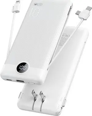 VRURC Portable Charger Built-in Cables and AC Wall Plug, USB C Power Bank 10000mAh, Travel Essentials Phone Charger Compact Lightweight External Battery Pack for Smart Phones, Tablets etc-White