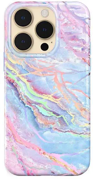 SOEWIOU for iPhone 14 Pro Case Marble - Girly Cute Protective Cover for Women - Compatible with MagSafe - 10ft Drop Tested - Holographic, Blue, Pink