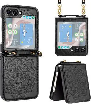 Mandala Flower Leather Protective Cover with Strap for Samsung Galaxy Z Flip 5 - Black