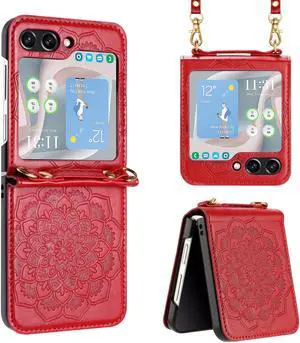 Mandala Flower Leather Protective Cover with Strap for Samsung Galaxy Z Flip 5 - Red