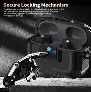 for Studio Buds/Bud + Case Cover with Lock Clip 2021/2023, Rugged Shockproof Protective Hard Skin with Carabiner&Cleaner Pen Men Women for Studio Buds/Bud Plus Earbuds - Black
