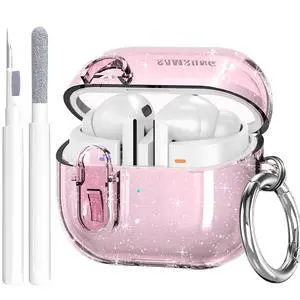 Compatible with Galaxy Bud 3 Pro Case/Buds3/Buds 3 FE Case Clear Lock Clip with Cleaner Kit, Transparent TPU Protective Cover Men Women with Carabiner, Glitter Pink