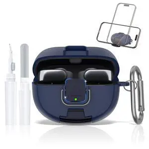 Ultra Open Earbuds Case with Secure Lock & Phone Stand, Soft TPU Shockproof Protective Clear Case for Open Ear Earbuds Accessories with Cleaning Pen & Keychain (Dark Blue)