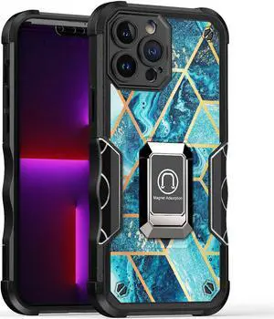 Military Grade Shockproof Hybrid Armor Case with Ring Grip for iPhone 14 Pro - Marble Blue