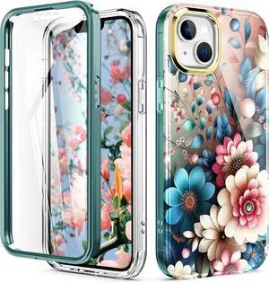 Designed for iPhone 13 Case 6.1 Inch, with Tempered Glass Screen Protector + Camera Lens Protector Clear Flower Soft & Flexible Shockproof Floral Women Phone Cover (Floratopia/Colorful)