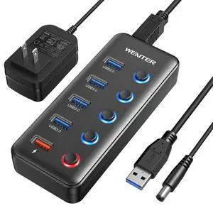 Powered USB Hub, Wenter 11-Port USB Splitter Hub (10 Faster Data Transfer Ports+ 1 Smart Charging Port) with Individual LED On/Off Switches, USB Hub 3.0 Powered with Power Adapter for Mac, PC