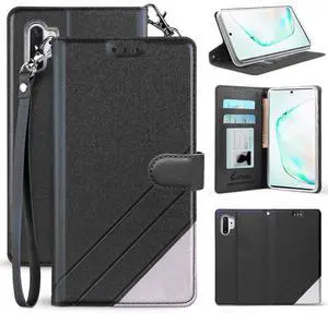 Black Wallet Case Stand Card Slot Cover + Wrist Strap for Galaxy Note 10 Plus
