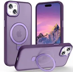 JAYSUING Magnetic for iPhone 15 Case with Ring Stand, [10 FT Drop Protection] [Velvety Touch] Slim Translucent Matte Back Shockproof Phone Case for iPhone 15 6.1'', Dark Purple