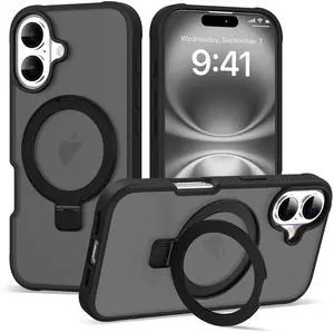 JAYSUING for iPhone 16 Case with Invisible Ring Stand [Military Drop Protection] [Compatible with Mag-Safe] Matte Translucent Back Anti-Slip Shockproof Phone Cover 6.1 Inch 2024-Black