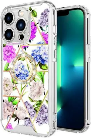Shockproof Fusion Shield Tough Snap-on Case with Ring Grip for iPhone 14 Pro - Flower
