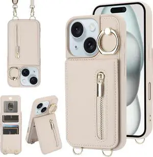 for iPhone 13/14 Wallet Case with Strap Card Slot Holder RFID Blocking Ring Kickstand Magnetic Flip Folio Zipper Crossbody Purse Case with Lanyard PU Leather Cover Handbag Beige