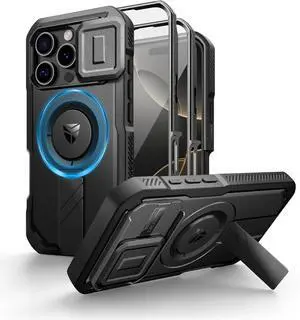 for iPhone 16 Pro Case with Slide Camera Cover & Adjustable Kickstand & Built-in Screen Protector Compatible with MagSafe Shockproof Bumper Cases Heavy-Duty Magnetic Protective Cover Black