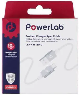 PowerLab 10-Ft Braided Charge-Sync USB-A to USB-C Cable - White/Silver