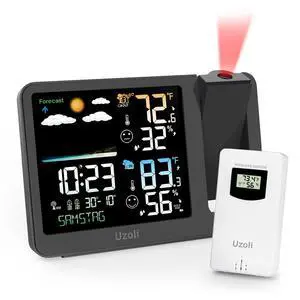 Projection Alarm Clock Weather Station, WWVB Atomic Projector Clock with Sensor, Adjustable Backlight, Indoor Outdoor Temperature Humidity, Digital Projection Clock for Bedroom Ceiling