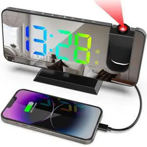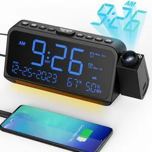 Projection Alarm Clock with FM Radio, USB Charging Port, 0-100% Dimmer, Dual Alarms, HD LED Display, 30 Preset Stations, Sleep Timer, 5 Alarm Sounds, Snooze, Curved Screen, Digital Clock for Bedroom
