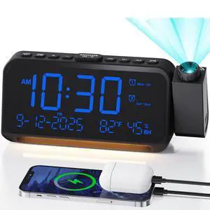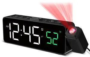 Digital Projection Alarm Clock for Bedrooms with Indoor Thermometer Hygrometer, USB Charger, Bedside Projector, Travel, AC and Battery Operated