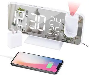 Projection Alarm Clock for Bedroom, Digital Clock with 180° Projector, 7" Large LED Display, Dual Alarms, Temperature&Humidity Display, Dual USB Port, 12/24H, Snooze, for Heavy Sleepers, White
