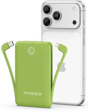 miisso 10000mAh Mini Portable Charger with Built in Cable, Pocket Size Power Bank Travel External Battery Pack for Phone, 3 Output USB Type C Cord Clutch Compatible with iPhone, Samsung, Green