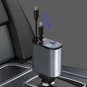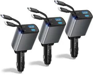 145W 4-Port Retractable Car Charger 3C1A USB C Fast Charger with 60W Retractable Cable Cigarette Lighter Adapter Compatible with MacBook Pro iPhone 17/16 Galaxy S25/S24 Ultra iPad Laptop