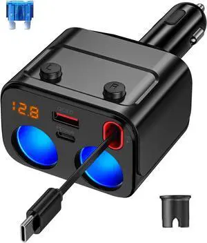 180W Retractable Car Charger Cigarette Lighter Splitter, 5 in 1 USB Fast Car Phone Charger with Retractable Cable 2 USB Ports, 2 Cigarette Lighter Socket with Separate Switch LED Voltmeter