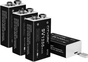 CITYORK 9V Battery 1200mAh PP3/MN1604/6F22/6LR61 USB Lithium Battery, with Micro USB Charging Port, Suitable for Smoke Alarms, Gas Stove, Guitar, Keyboard 4-pack