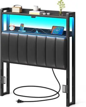 Rolanstar Headboard for Twin Size Bed with Storage, 60,000 DIY Color of LED Light, Head Board with USB & Type C Port, Height Adjustable, Black Upholstered Cabeceras de Cama Comfortable Modern, Leather