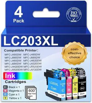 LC203XL LC201 BK/C/M/Y Ink Cartridges High Yield (4-Pack) Compatible Ink Cartridges Replacement for Brother LC203 XL LC201 with MFC-J480DW MFC-J485DW MFC-J880DW MFC-J4420DW Printer