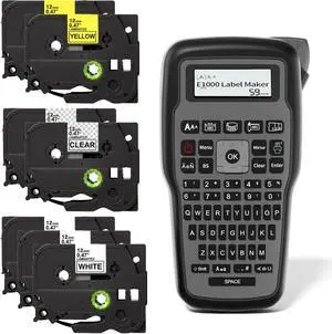 Electriduct E1000 Label Maker Thermal Transfer Portable Printer Handheld Labeler QWERTY Keyboard + 7 Tape Cartridges Black on White, Clear and Yellow