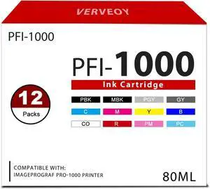 PFI-1000 12 Color Pack Ink Tank with Chip Replacement for Canon Lucia PRO PFI-1000 Ink Cartridge 80ml for imagePROGRAF PRO 1000 Printer (12-Pack, MBK, PBK, C, M, Y, R, GY, B, PGY, PC, PM, CO)