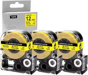 3PK 12mm SC12YW Tape for Label Maker LW-700 Compatible with SC12YW LK-4YBP Black On Yellow Label Tape Printer Ribbon