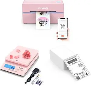 MUNBYN Bluetooth Thermal Label Printer 941B+Pink Shipping Labels+Shipping Scale, Accurate 66lb/0.1oz Postal Scale with Sweet Pink Style