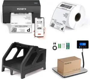 MUNBYN Bluetooth Thermal Label Printer 941B+Thermal Direct Shipping Label (Pack of 500 4x6 Per Roll Labels)+Label Holder for Rolls and Fanfold Labels+IPS03 440lb for Postal Scale