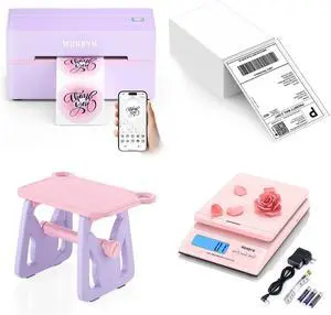 MUNBYN Bluetooth Thermal Label Printer, 4x6 Shipping Label Printer+Pink Shipping Labels+Purple Label Holder+Shipping Scale, Accurate 66lb/0.1oz Postal Scale with Sweet Pink Style