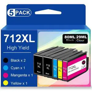 5 Pack 712XL Ink Cartridges Replacement 712 Ink Cartridge 80ml Remanufactured for HP DesignJet T650 T630 T250 T230 T210 Studio Plotter Printer(2X Black,1x Cyan,1x Magenta,1x Yellow)