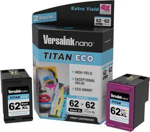 VersaInk-Nano 62 XL Titan ECO Black & Tri-Color Ink Cartridge 2-Pack Replacement of HP 62 and 62 XL, Works with HP Envy 7640, 5660, 5540, OFFICEJET 5740,5743,5741,8040,5744,250 Mobile,200 Mobile