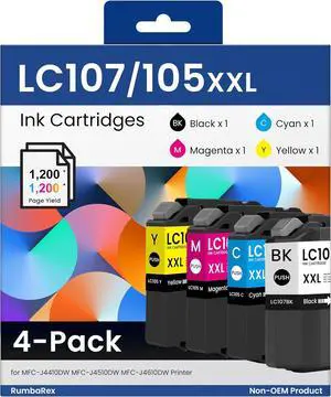 LC107 LC105 XXL Ink Cartridges High-Yield LC107BK LC105C LC105Y LC105M Replacement for Brother LC107 LC105 LC105CL Ink for MFC-J4310DW MFC-J4410DW MFC-J4510DW MFC-J4610DW MFC-J4710DW Printer Ink 4PKS