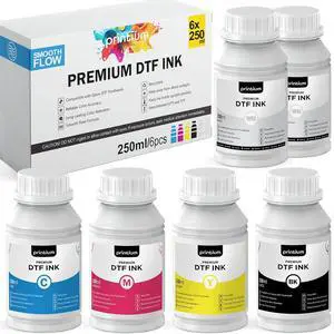 DTF Ink 6-Pack Set 2× White + CMYK 250 ML (8.45 fl oz Each, Total 1500 ML) High Opacity, Clog-Free Formula, Smooth Ink Flow Works with All DTF Printheads and Printers