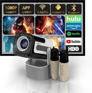 [Built-in Apps] 5G WiFi Bluetooth Smart Projector,Comes with a mini stand ,Mini Projector with Stereo Speaker,4K support HD Portable Projector, Compatible with TV Stick Smartphone/ pc/USB (With Apps)