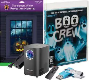 HoliScapes® USB Projector Kit - AtmosFx Boo Crew USB + Projector + 48" x 72" Large White Holographic Screen for Halloween Projection