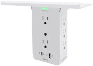 Surge Protector Wall Outlet, 8 Socket Extender with USB-A and USB-C Ports, Removable Built-in Shelf, Wall Mounted Rack, Plug Adapter for Home, School, Office, White.