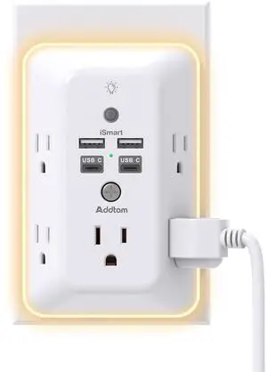 Surge Protector, Outlet Extender with Night Light, Addtam 5-Outlet Splitter and 4 USB Ports(2 USB C), USB Wall Charger Power Strip, Multi Plug Outlet for Home, Office, School, ETL Listed