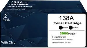 138A Black Compatible Toner Cartridge (with Chip) Replacement for HP 138A W1380A 138X W1380X, Compatible with Pro 3001dw 3001fdw Printers and LaserJet Pro MFP 3101fdw Series Printers (2 Pack Black)