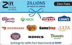 Zift Zillions of Gifts eGift Cards are issued by Pathward®, N.A., Member FDIC. Cards are distributed and serviced by InComm Financial Services, Inc. Cards are only redeemable at ZillionsGift.com, for eGifts from participating brands, within the USA. Brand options and amounts may vary and are subject to change. Merchant trademarks are the IP of the respective merchants and are used with permission. No cash or ATM access. Terms and conditions apply. See Cardholder Agreement for details.