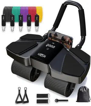 Ab Roller Home Gym Equipment 4 Wheels Ab Wheel Muscle Roller with LCD Screen, 5Pcs Resistance Bands, Ankle Straps, Door Anchor, Handles, Travel Bag Comfortable Elbow Support with Non-Slip Handles