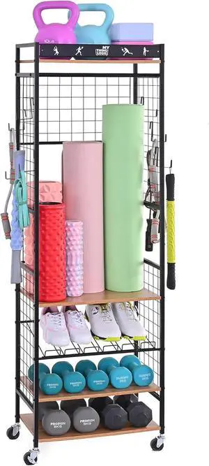 Weight Rack Home Gym Storage, Yoga Mat Storage Rack Workout Equipment Storage Rack for Dumbbells Kettlebell Resistance Band, Exercise Equipment Gym Rack Organizer with Wheel and Levelling Feet