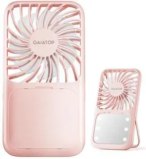 Portable Handheld Fan, 3 Speed LED Makeup Mirror with Light, Folding Stand for Desktop, Rechargeable Mini Personal Fans Small Travel Essentials Gifts for Women Girls