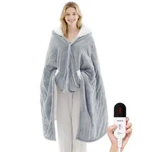 Heated Blanket Wearable Electric Blanket with Hood and Pockets, Heating Throw Blanket, Electric Heated Wrap Shawl with 6 Heating Levels Setting & 4 Hours Auto Shut Off, Machine Washable(Shrot, Grey)