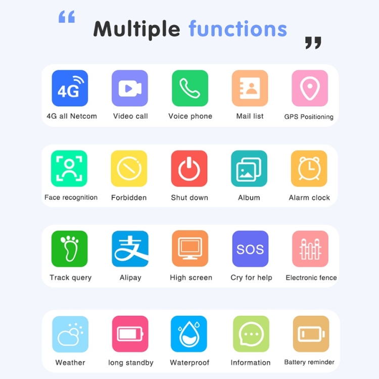 4. Function: Waterproof, audio and video entertainment, photography, pedometer, social entertainment, intelligent reminder, information push, weather, mobile positioning, tracking/alarm, alarm clock, face recognition, sports tracking, sleep analysis