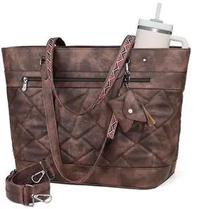 FADEON Quilted Tote Bag for Women, Designer Laptop Purse with Compartments, Large Leather Shoulder Handbag for Travel, Work, Daily, Teacher Brown